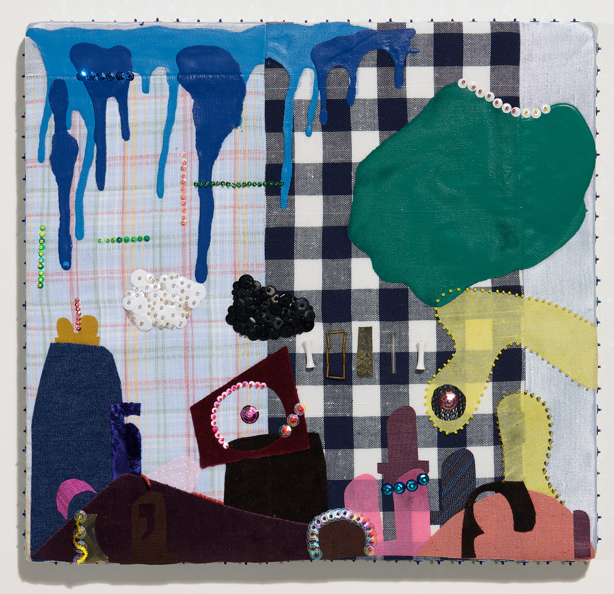 Recycled fabric, house paint, and hand-stitched sequins and beads