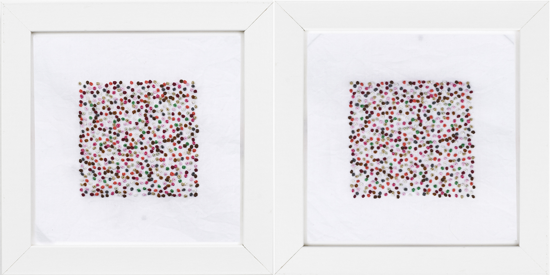 L: Six Hundred French Knots, R: Six Hundred French Knots by The Assistant, 2010, 5″ x 5″ each