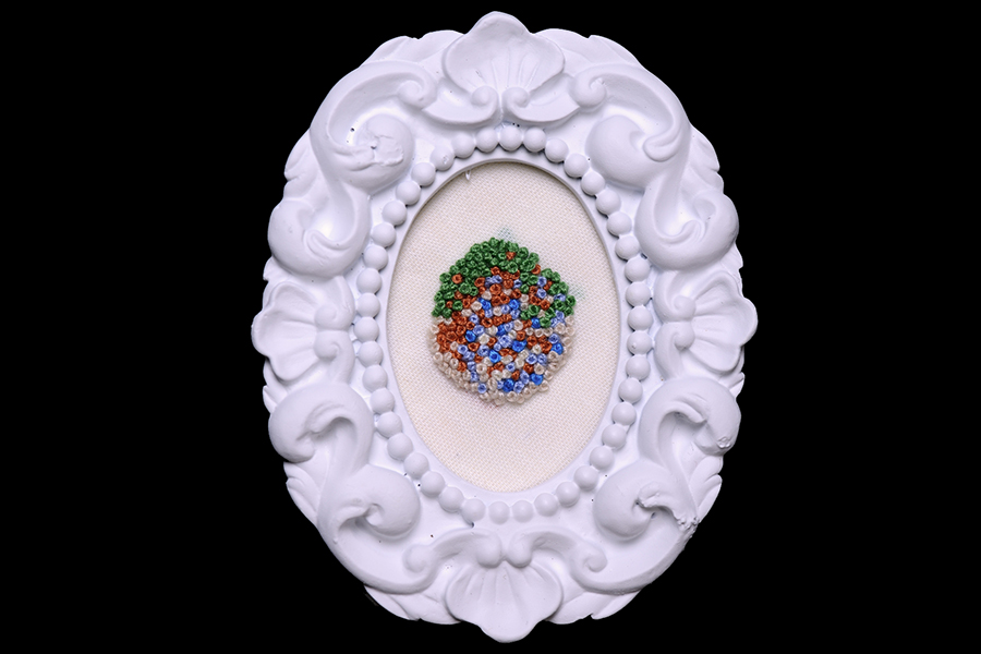 200 precisely counted French knots on cotton in artist-altered frame