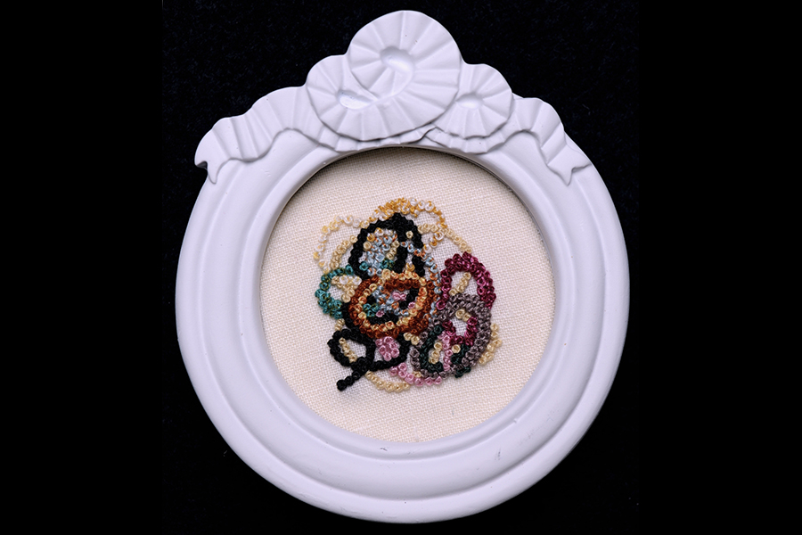 370 precisely counted French knots on cotton in artist-altered frame