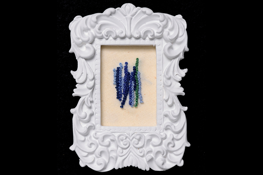 130 precisely counted French knots on cotton in artist-altered frame