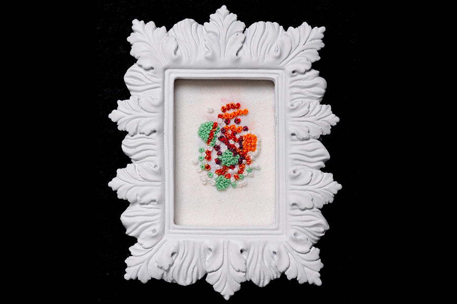 160 precisely counted French knots on cotton in artist-altered frame