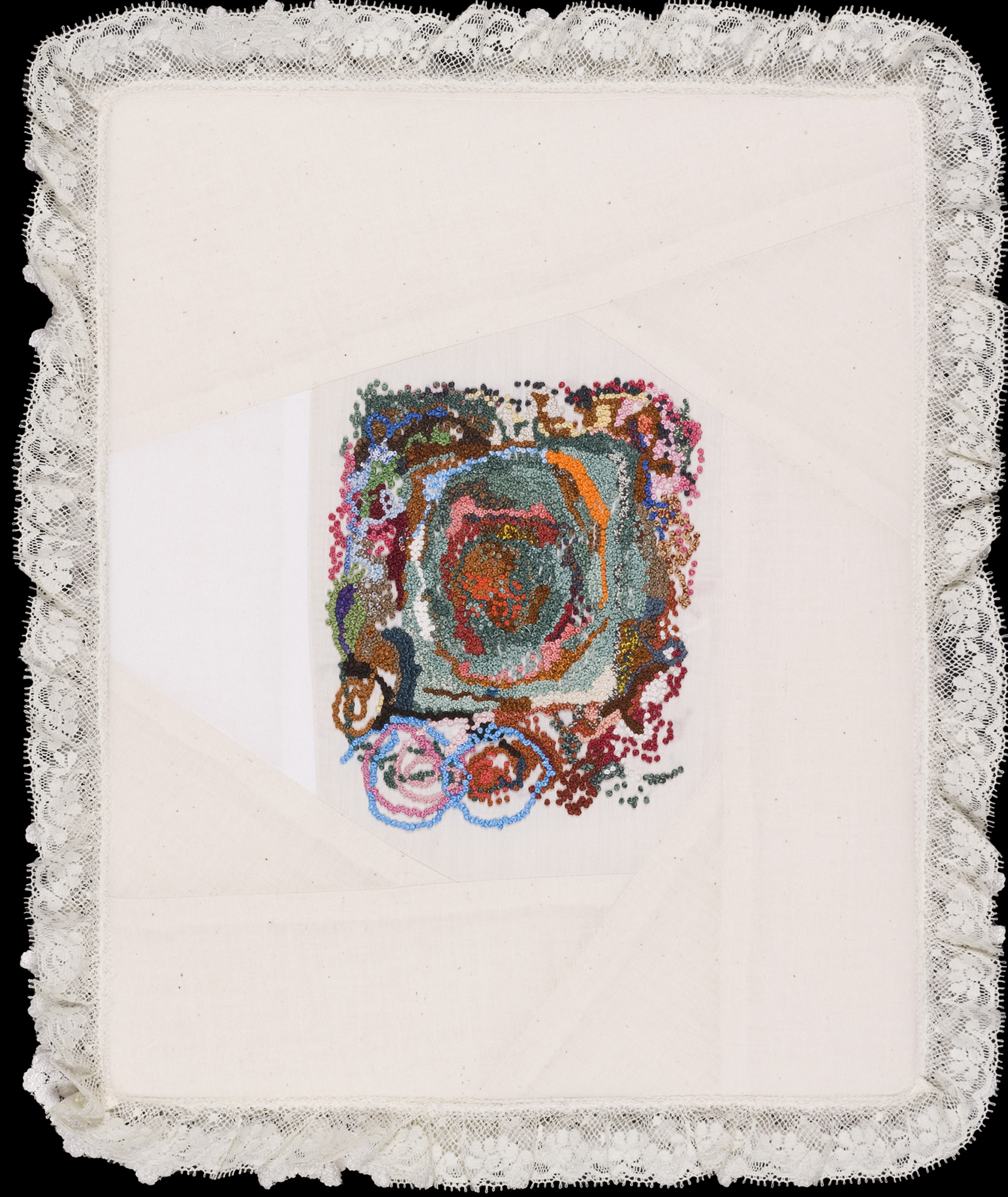 5000 precisely counted French knots on cotton, with frou-frou trim
