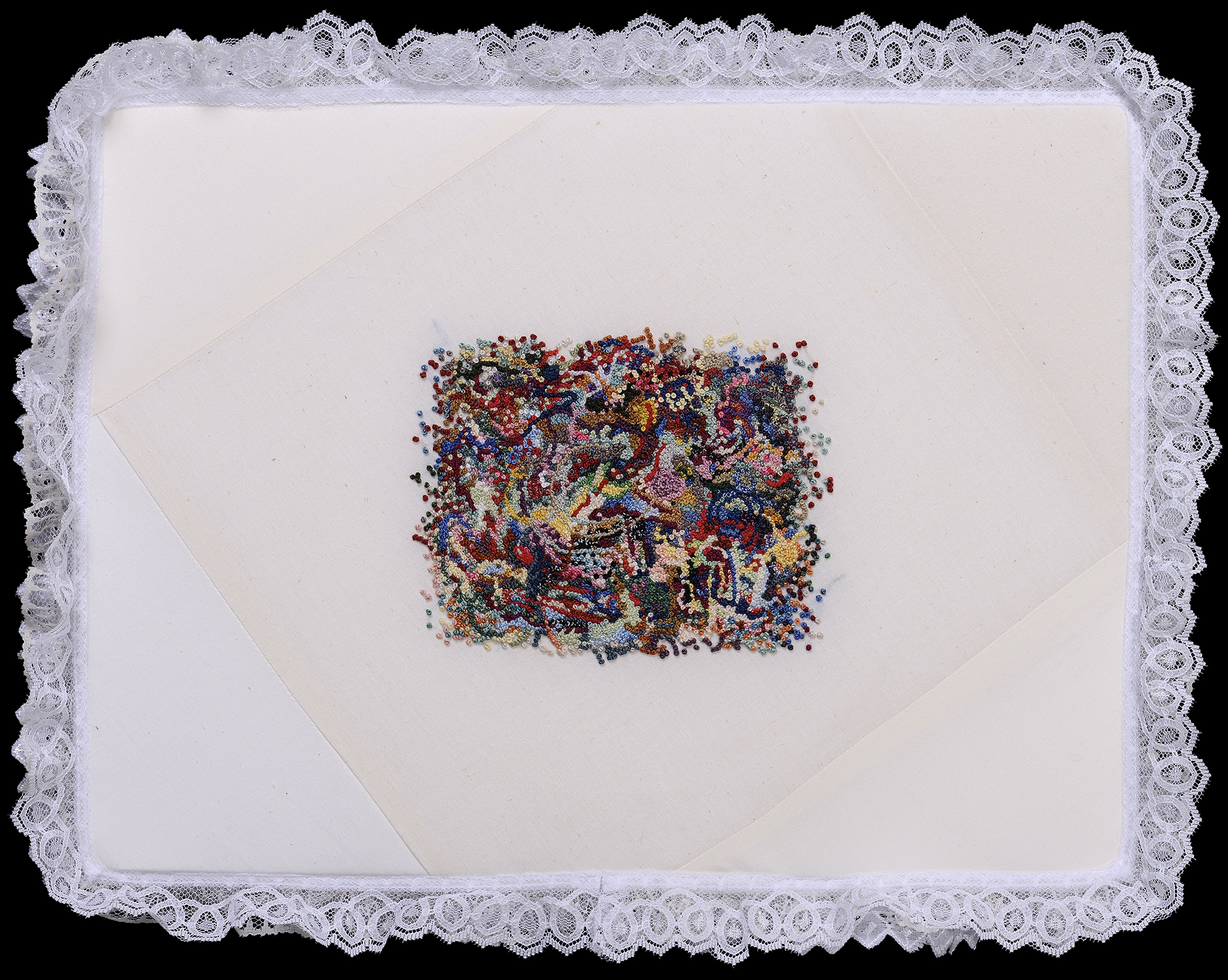 6000 precisely counted French knots on cotton, with frou-frou trim