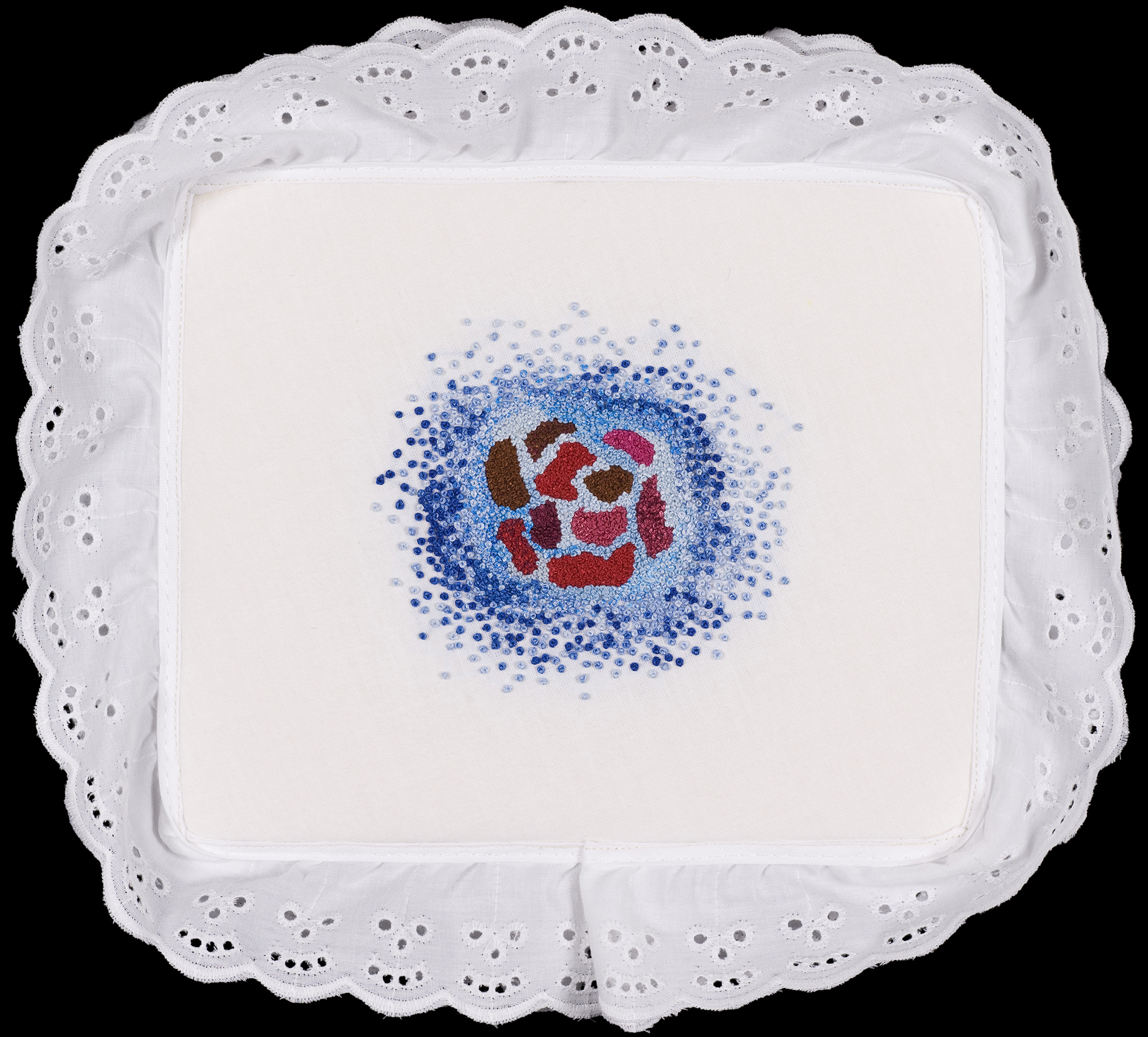 2200 precisely counted French knots on cotton, with frou-frou trim