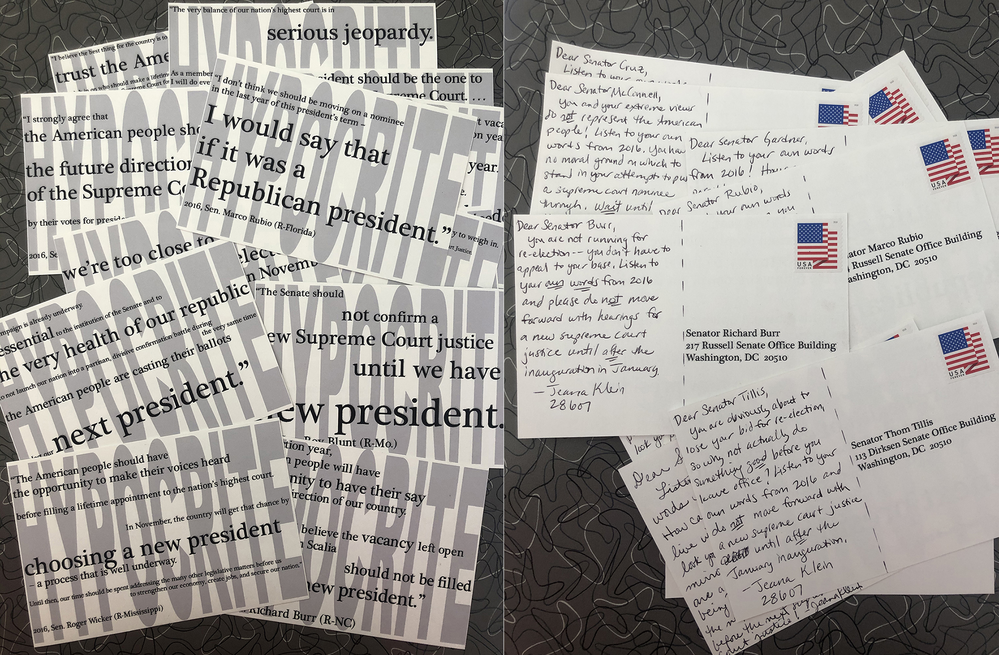 When Ruth Bader Ginsberg died and the Republicans rushed to replace her, I created a series of postcards that quoted their hypocritical statements when they had refused a hearing for Merrick Garland. I compiled these as a single PDF that had their words with “hypocrite” on the front and their addresses on the back, then shared it as a free, downloadable PDF and hundreds of people sent these postcards to their senators)