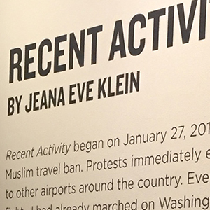 Recent Activity began on January 27, 2017: the day President Trump enacted the Muslim travel ban. Protests immediately erupted at JFK airport and then spread to other airports around the country. Every cell in my body itched to join the fight – I had already marched on Washington and was calling my representatives daily – but I live high in the mountains of North Carolina, two hours from the closest airport. So, I participated in the only way I really could: scrolling through my Facebook news feed, doling out hearts and thumbs-ups to all the people doing the important work of making voices heard. It felt painfully inadequate. In that moment, I realized that – in this new political reality – I could no longer maintain the precarious balance of my life. Increasing my political involvement on top of the roles I already inhabit – artist, educator, mother, wife—rendered me utterly incapable of successfully fulfilling any of them.