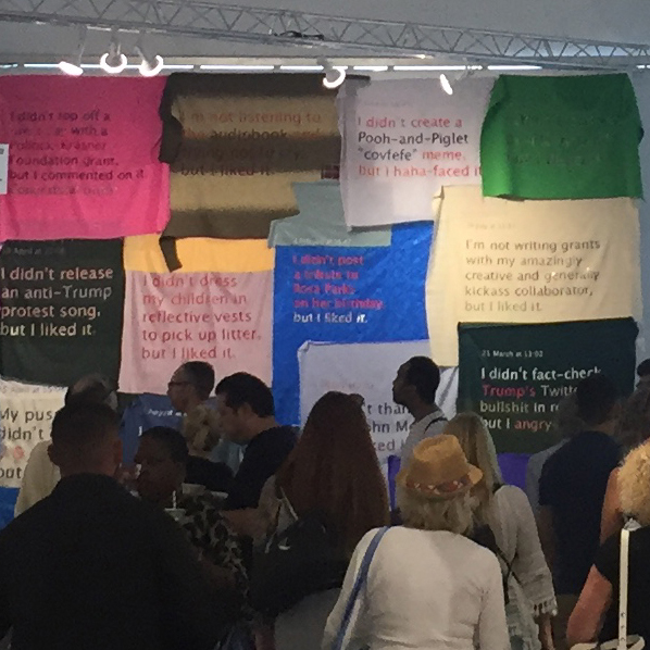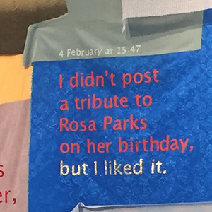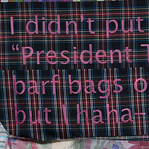 Through this work, I am thinking about the false sense of participation, the ineffective activism, the twice-removed relationship to concrete action, and the echo chamber of social media. I am thinking about the power of mere headlines and the density of the news cycle. I am thinking about the personal inadequacies that are inevitably summoned by documentation of others’ activities. I am thinking about the impossibility of doing everything and being everywhere.
