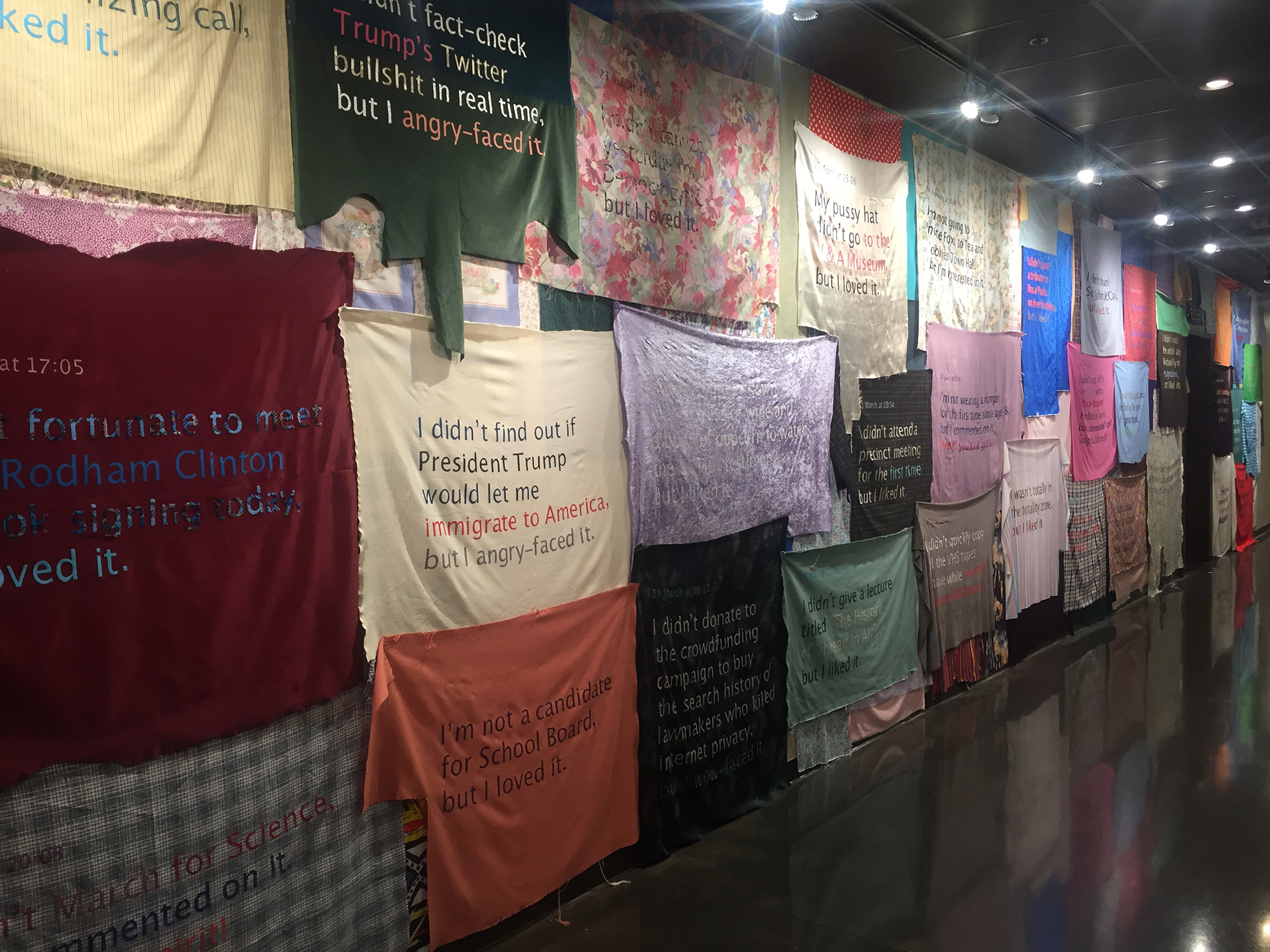 Hand-cut recycled fabric lettering on recycled fabric panels documenting my responses to others’ social media posts