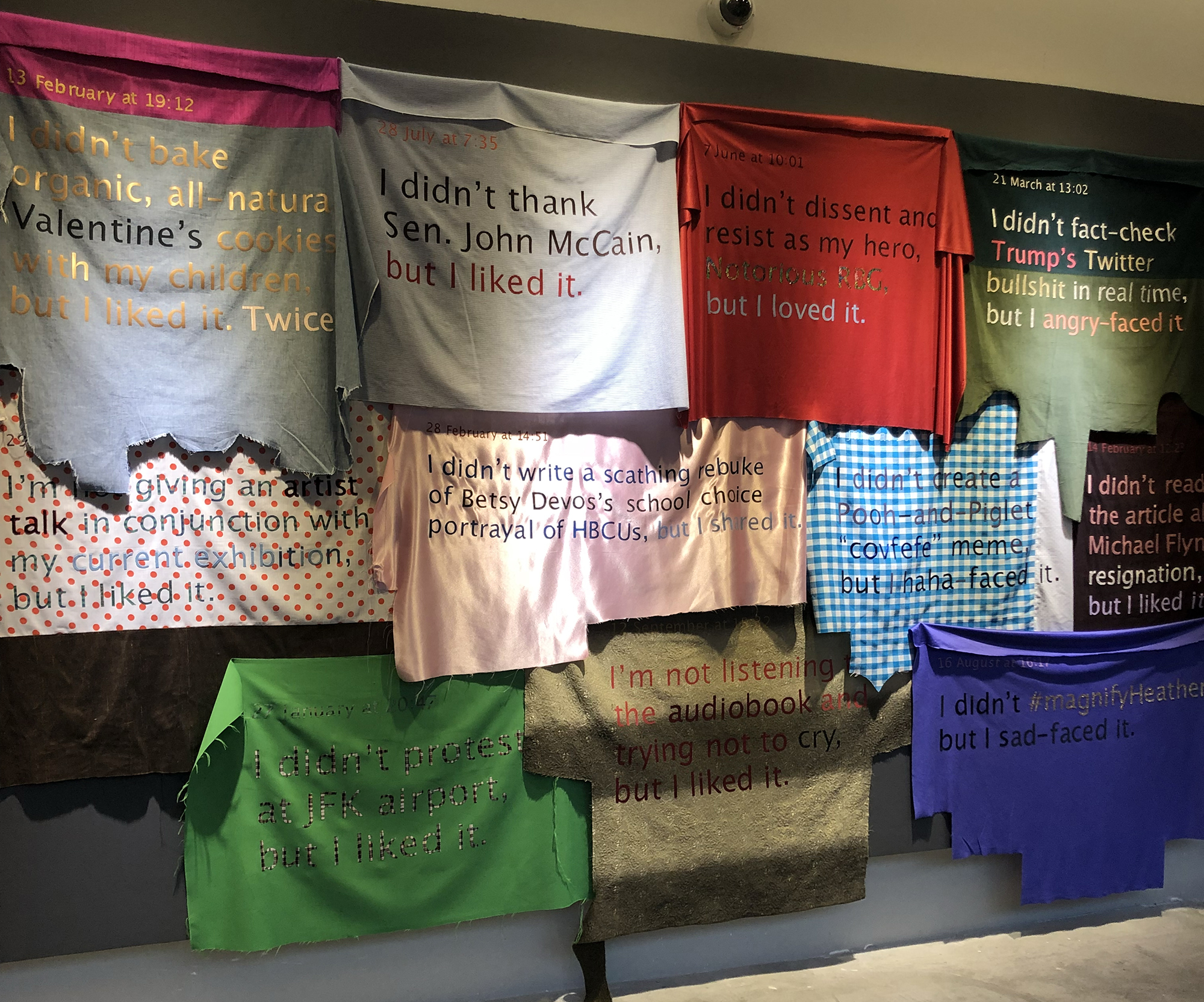 Hand-cut recycled fabric lettering on recycled fabric panels documenting my responses to others’ social media posts