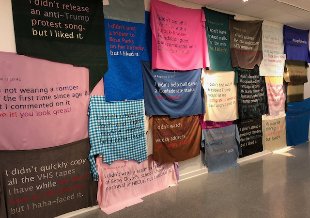 Hand-cut recycled fabric lettering on recycled fabric panels documenting my responses to others’ social media posts