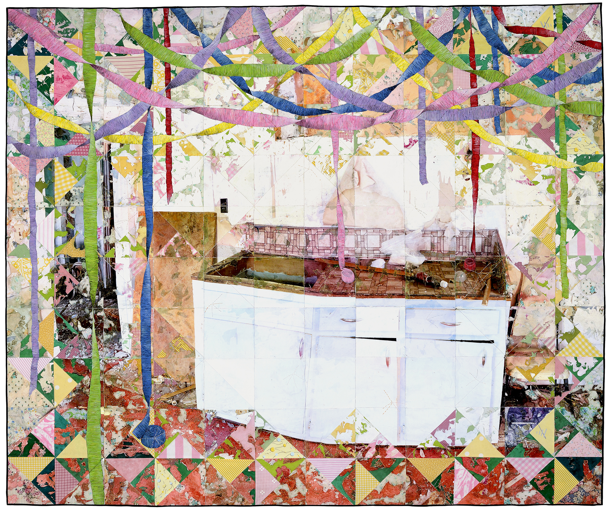 Digital printing, acrylic paint and dye on recycled fabric; machine-pieced and hand-quilted