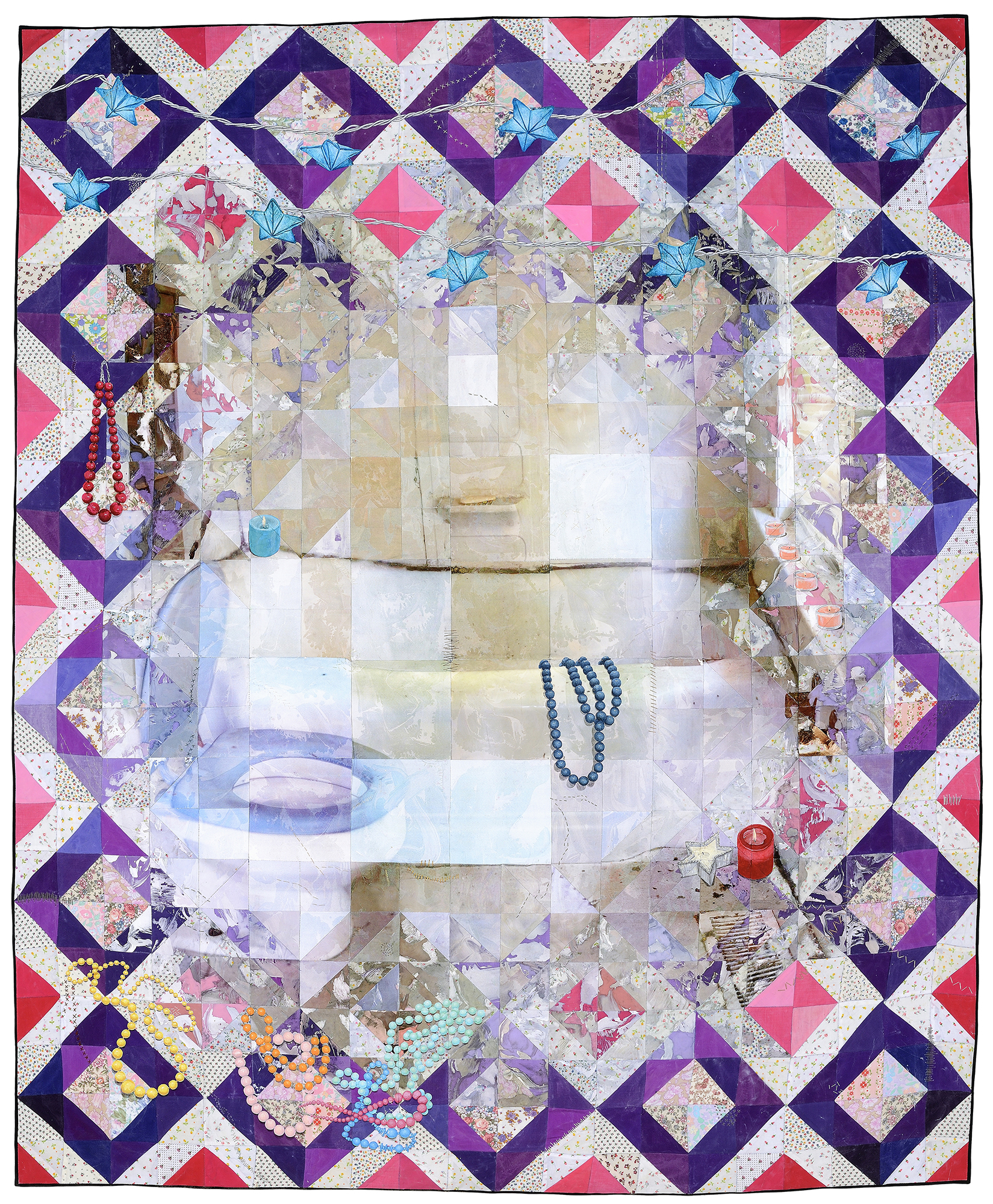 Digital printing, acrylic paint and dye on recycled fabric; machine-pieced and hand-quilted