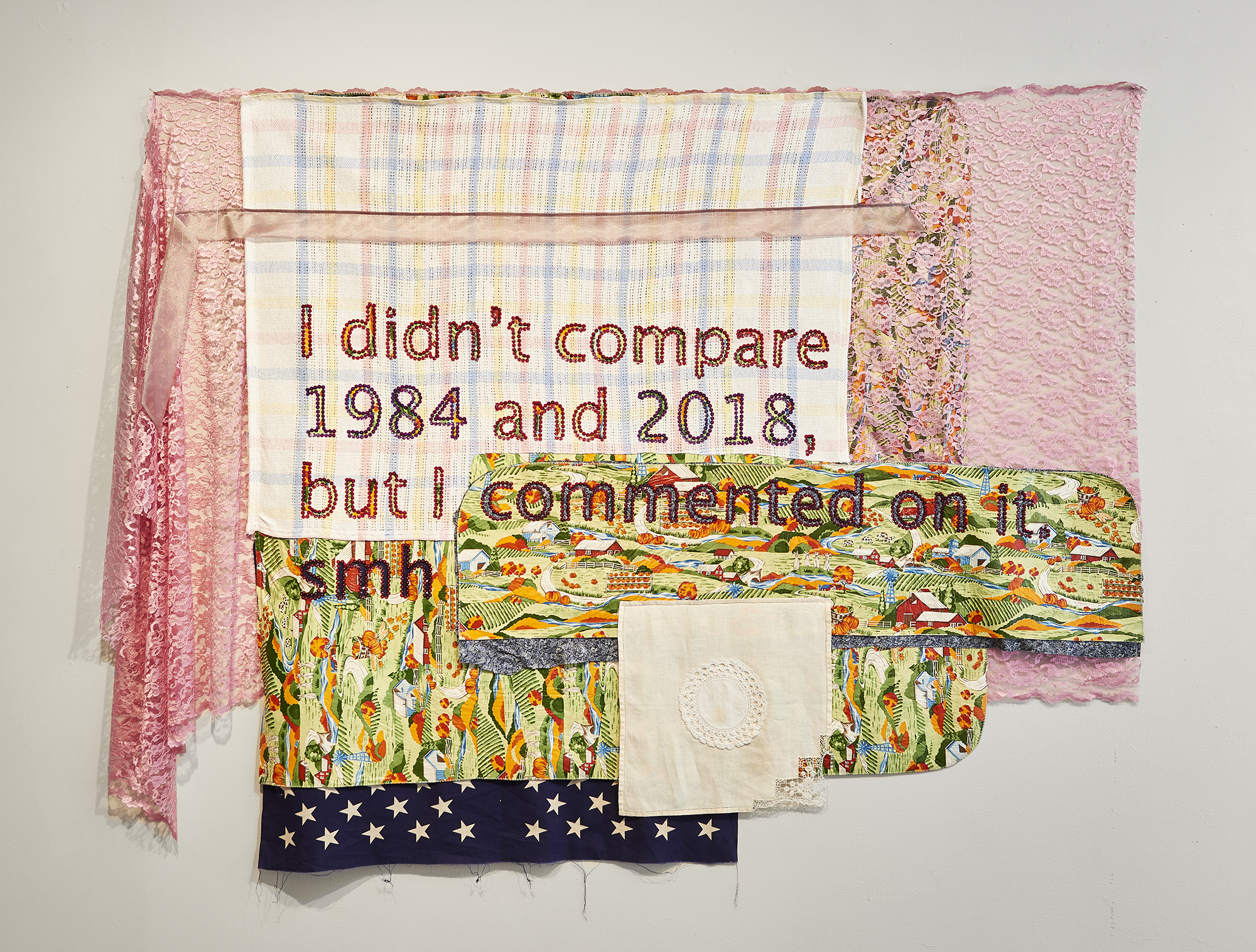 Recycled textiles, hand-cut reverse-appliqué lettering, hand-stitched sequins and beads
